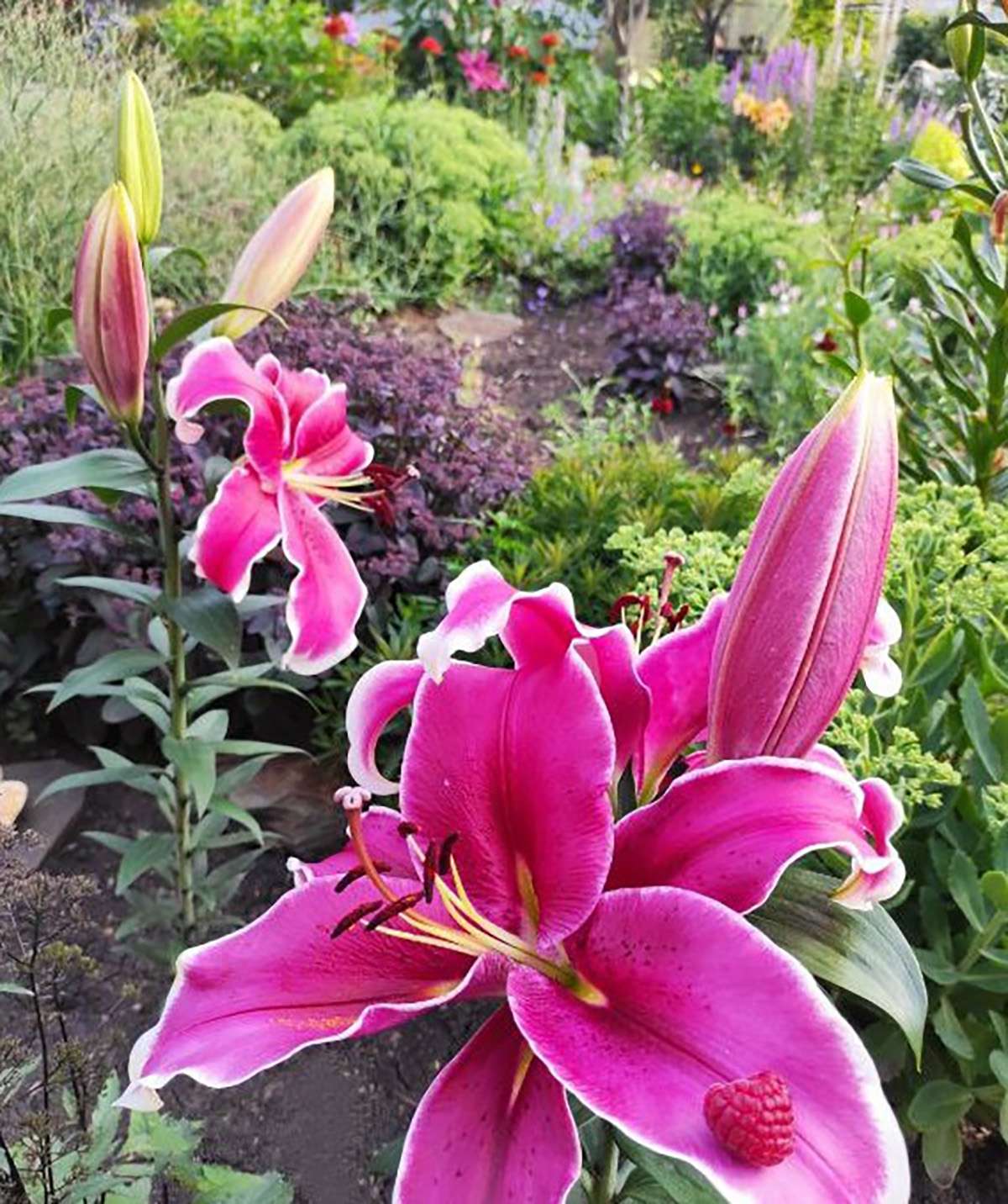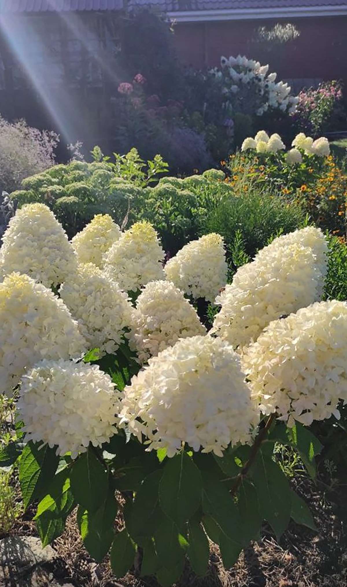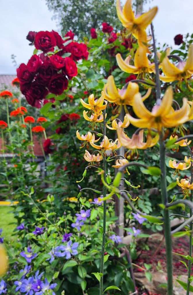 – В данный момент цветут лилии ОТ – гибриды. Запах стоит по всему саду. Они прекрасно у нас зимуют. Их высота иногда достигает метр восемьдесят, говорят, что бывает и больше. Ну, тут уж, наверное, сдует. Еще у меня много гортензий.