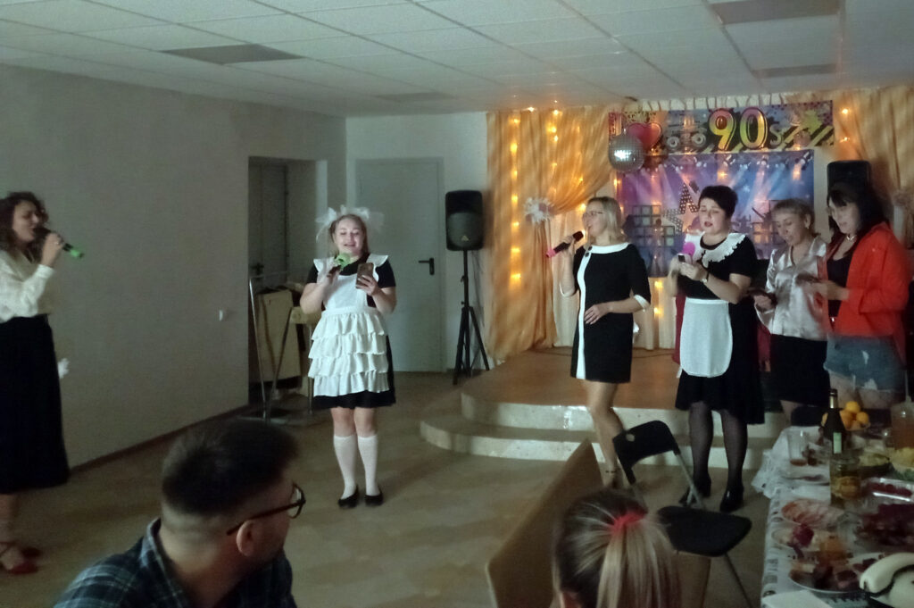Огромное спасибо организаторам праздника: Дине Мартенс, Марии Липс, Екатерине Матвеевой. Девушки создали атмосферу времени, в котором прошли наше детство и юность. На стенах были плакаты советских времён, наш стол украшала скатерть в виде газеты и красовалась керосиновая лампа. А какой ностальгической была фотозона: радиола, телефон, счёты, авоська с мандаринами и бутылкой молока!